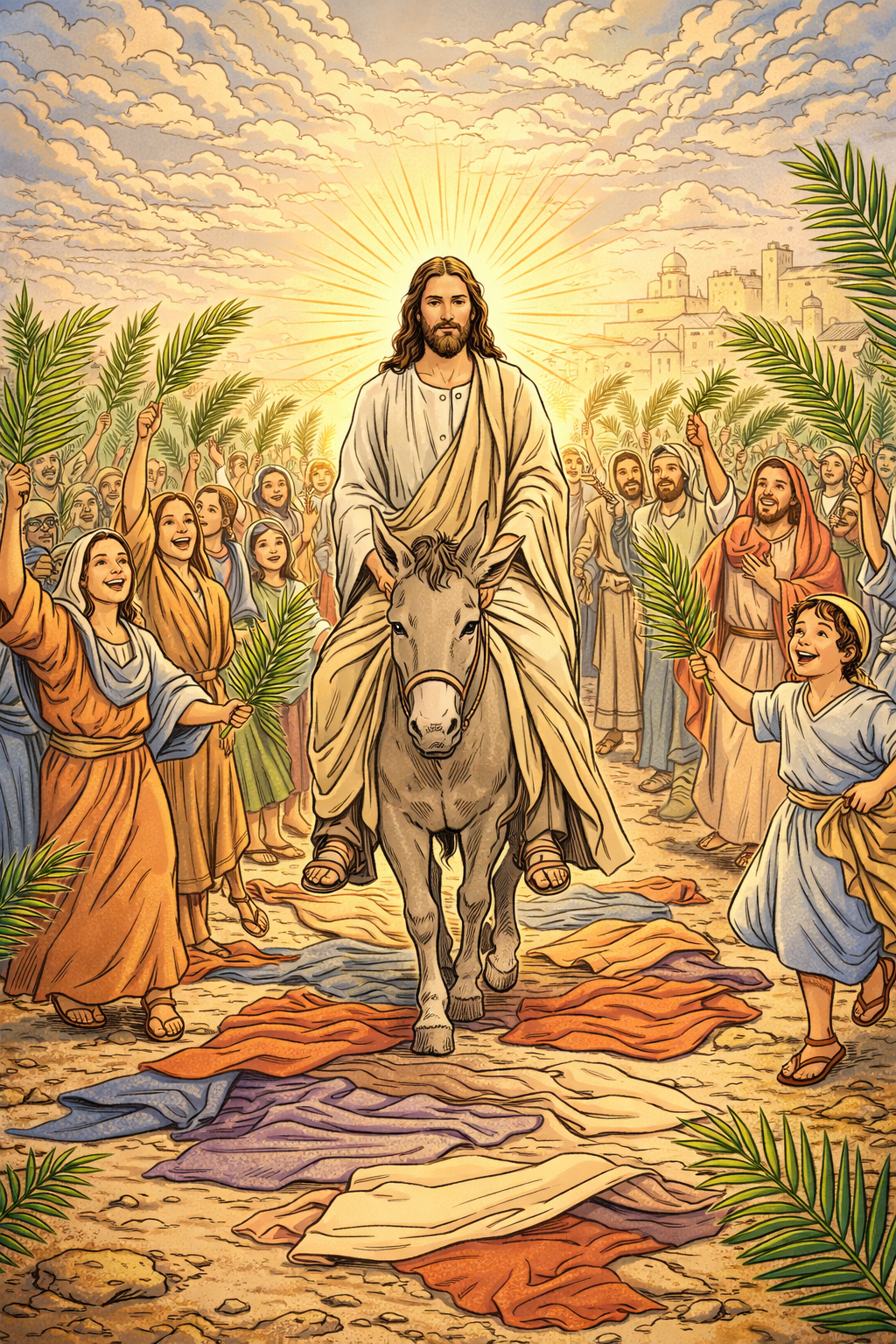 The Gospel at the procession recounts Jesus entering Jerusalem on a donkey. Crowds gather, spreading cloaks and palm branches on the road, shouting “Hosanna to the Son of David!”